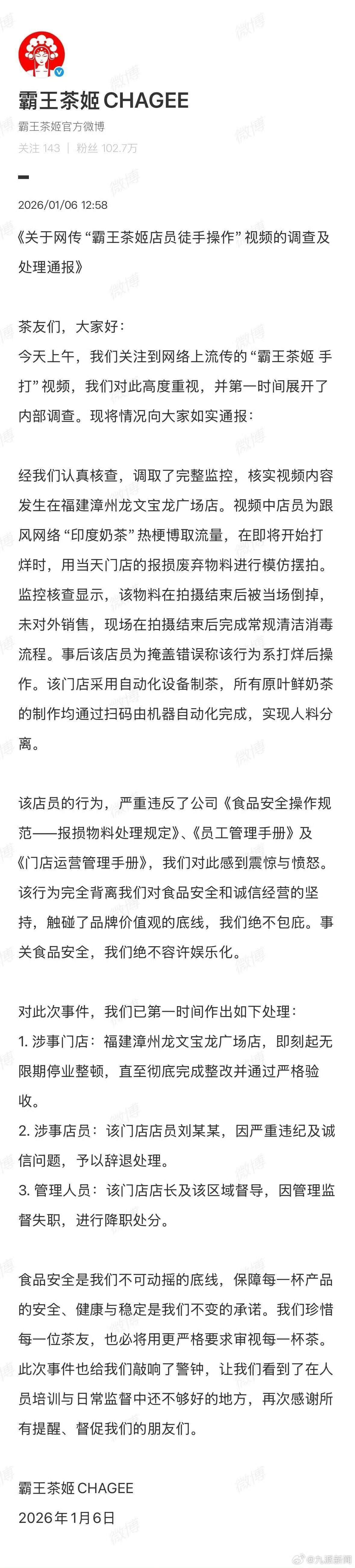 1月6日午间,霸王茶姬官方核查阐明涉事门店为福建漳州龙文宝龙广场店,马上作出通报,官方强调,时时彩app下载职工当作严重违犯食物安全操作要领,拍摄所用报损物料已马上狂妄,未对外售售,门店宽泛条目职工捎带手套、使用专科用具操作。门店惯例汲取自动化设立制茶,东谈主料分离。霸王茶姬指出该伴计的当作,严重违犯了公司《食物安全操作要领—报损物料处理执法》、《职工处分辨册》及《门店运营处分辨册》,品牌对此感到胆怯与震怒。该当作有余背离品牌方对食物安全和诚信标的的坚握,触碰了品牌价值不雅的底线,品牌方毫不包庇。事关食物安全,霸王茶姬绝阻难许文娱化。
