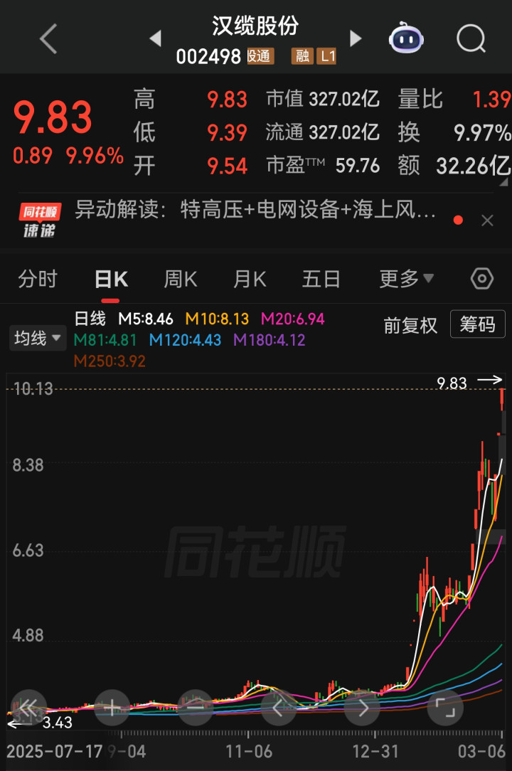 临了说说汉缆股份,3月6日该股见效晋级3连板,成为电网开导板块的连板龙头,短线资金温煦度极高 。汉缆股份的中枢优势围聚在电线电缆领域的全品类和高档第布局,公司主营高压、超高压电缆等家具,家具粉饰电力、新动力、海洋工程等多个领域,在特高压电缆、海底电缆等高端家具上具备中枢竞争力。当下人人电网革新和特高压确立股东,电线电缆行动电网确立的基础材料,需求不息擢升,而国际电网步调老化带来的革新需求,也为汉缆股份的家具出口带来了机遇。同期,公司在海洋电缆领域的布局,也能充分受益于海优势电的发展,多赛说念需求共振让其具备了不息的功绩维持,这亦然短线资金追捧的清贫原因。