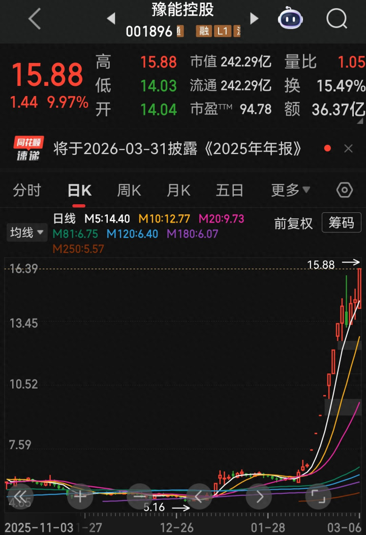 先看豫能控股,这只股可以说是近期电力板块的“东说念主气龙头”。3月6日今日,豫能控股以14.04元低开后,股价一齐颤动走高,最终以15.88元涨停收盘,涨幅9.97%,全天成交额达到36.37亿,在电力板块中位居前哨,换手率也达到15.49%,资金交游活跃度拉满,走出了12天8板的强势走势,在高位颤动后见效反包涨停,足见资金对其的追捧 。豫能控股的中枢优势体当今紧跟政策布局的“算电协同”和绿电产业链,行动地点电力龙头,公司深度绑定区域动力发展,在算力租出和绿电供应上造成了联动优势,而本年政府使命讲解初度将“算电协同”写入新基建工程,这一政策利好让豫能控股充分受益,成为资金炒作的中枢逻辑之一。同期公司在区域电力供应中的地位露出,能充共享受电力需求增长带来的红利,这亦然其股价不息走高的基本面维持。