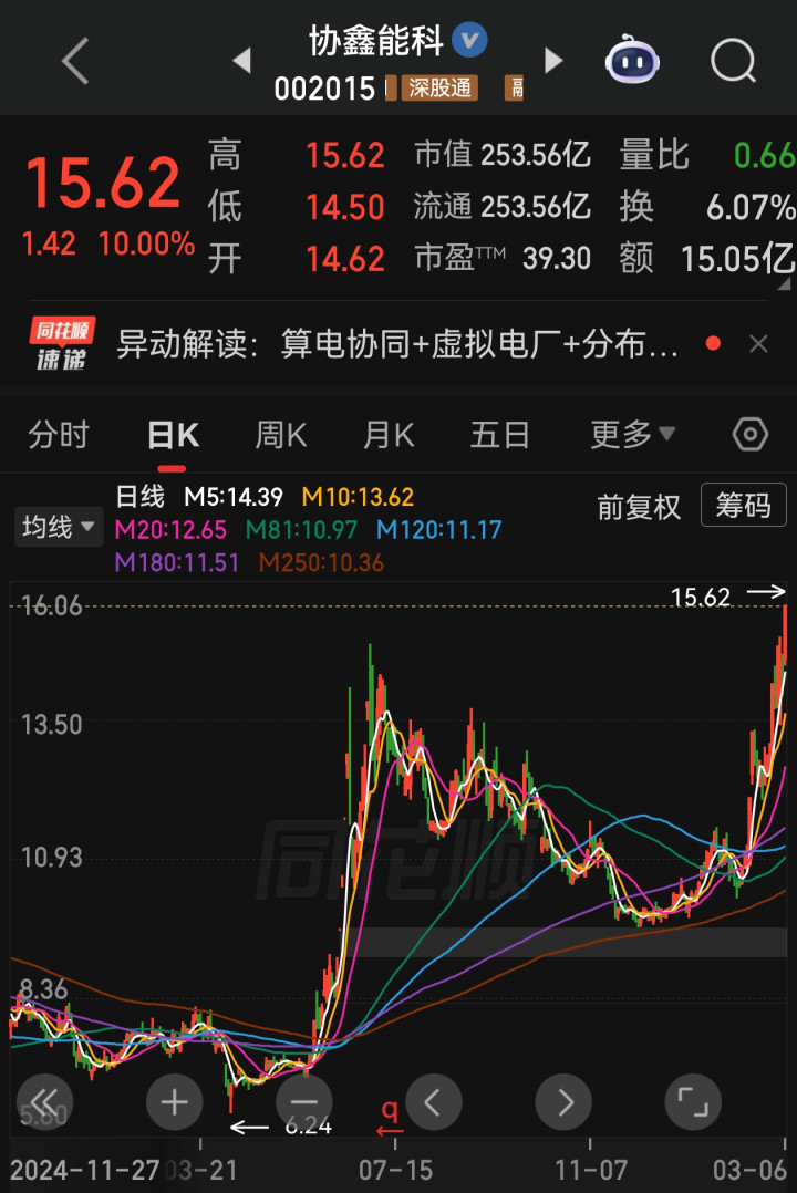 协鑫能科在3月6日也迎来涨停,股价以14.62元开盘后一齐走高,最终收于15.62元,涨幅10%,成交额15.05亿,换手率6.07%,走势庄重。协鑫能科的中枢优势体当今动力职业的多元化和数智化布局,是电力市集革新中的“时尚选手”。公司是江苏省首批臆造电厂运营商,团员可调负荷超1000MW,AI开动的调遣反应达秒级,在长三角臆造电厂市集市占率卓越;同期亦然绿电交游先驱,累计绿电及绿证交游超3亿kWh,碳钞票年交游量超485万吨。此外,公司布局工生意储能、光储充一体化技俩,造成了“源-网-售-用-云”的一体化政策,还与蚂蚁数科配合优化电力交游策略,AI工夫能擢升现货交游收益8%以上,竣工契合当下电力数智化的发展主张。在臆造电厂和储能行业快速发展的配景下,协鑫能科的多元化布局让其具备了较强的成长弹性。